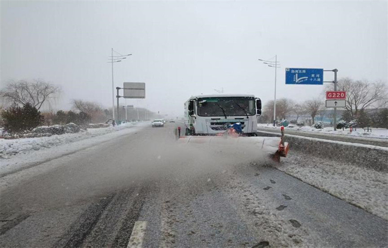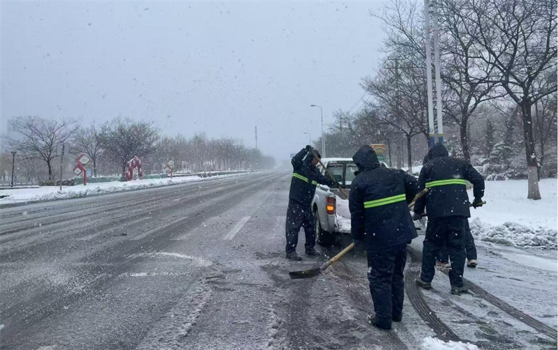 降雪后,按照“雪随下随清”的原则,待命队员迅速行动,在包保路段通过滚刷铲雪、撒布融雪剂、人工清扫等方式循环作业,高效开展除雪工作。
