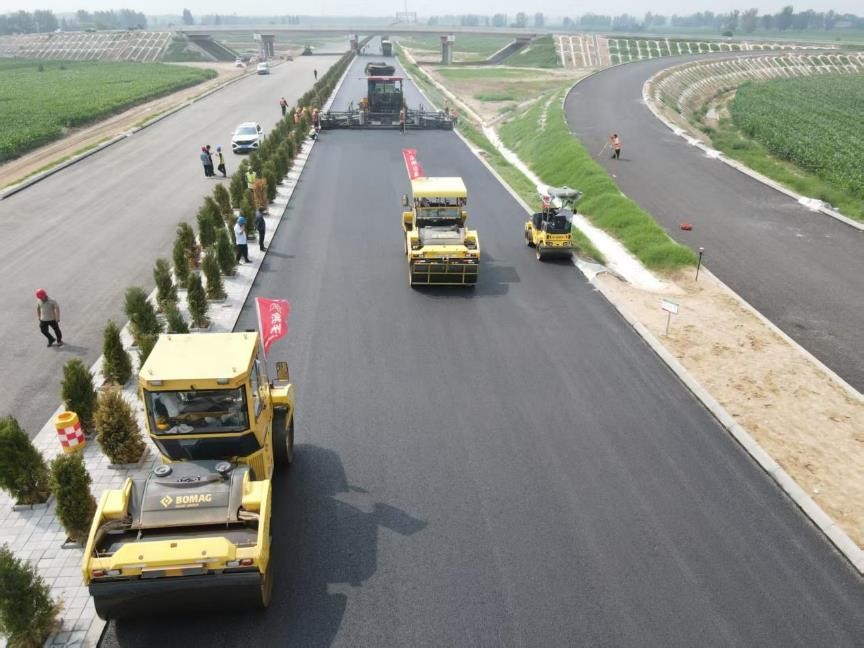 施工现场机械轰鸣、井然有序。160℃高温的沥青混合料由运输车精准送达,大型摊铺机匀速摊铺,双钢轮、胶轮压路机组成的碾压梯队按“先静后振、先慢后快”工艺梯次压实。经专业检测,试验段路面平整度、压实度、厚度等核心指标全部合格,为后续大面积施工敲定了“最优施工参数表”。